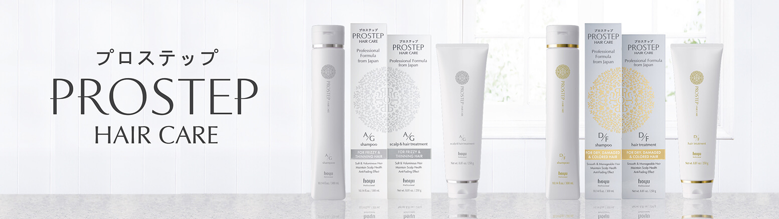 Prostep hair care addresses hair and scalp concerns. The range focuses on the continued hair care at home with color care function that reduces damage and prevents color fading. In addition, Prostep hair care also manages the deterioration of hair quality and scalp concerns caused by aging.